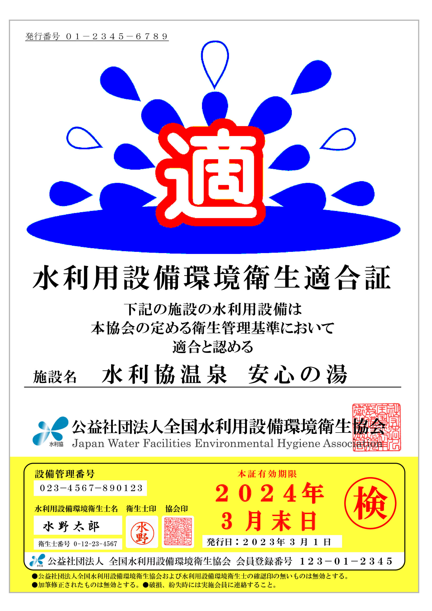 同適合証は、水利協に加盟している正会員による清掃と、水質およびレジオネラ検査などの衛生管理が実施され、各都道府県の条例に適合した施設に対して発行される。