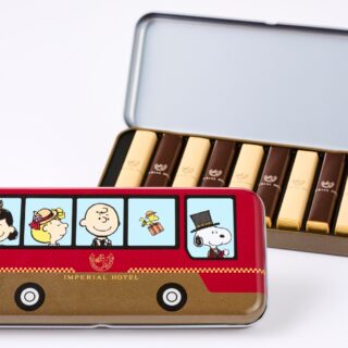 「ドアマン・スヌーピー 缶入りチョコレート」は、「ドアマン・スヌーピー」の今年度第3弾となる新商品です。2001年に誕生した「ドアマン・スヌーピー」は帝国ホテル 大阪開業当初のドアマンの制服を身につけており、帝国ホテル 大阪でしか会えないスヌーピーとして20年以上にわたり人気を博しています。「ドアマン・スヌーピー」と『PEANUTS』のなかまたちが帝国ホテル 大阪のシャトルバスに乗ったデザインの化粧缶に、スティックチョコレートを詰めました。化粧缶はチョコレートをお召し上がりいただいた後は小物入れなどとしてご活用いただくことができ、冬のプレゼントとしてもおすすめです。
