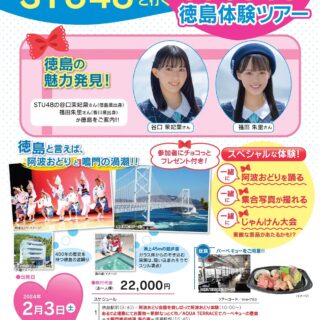 徳島県の魅力をSNS 等で発信する 「とくしまLOVE サポーター」に就任いただいている、STU48 の谷口茉妃菜さん、福田朱里さんと巡るバレンタインバスツアーの参加者を募集します。