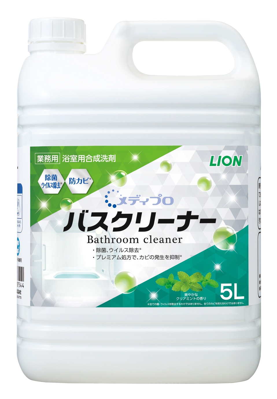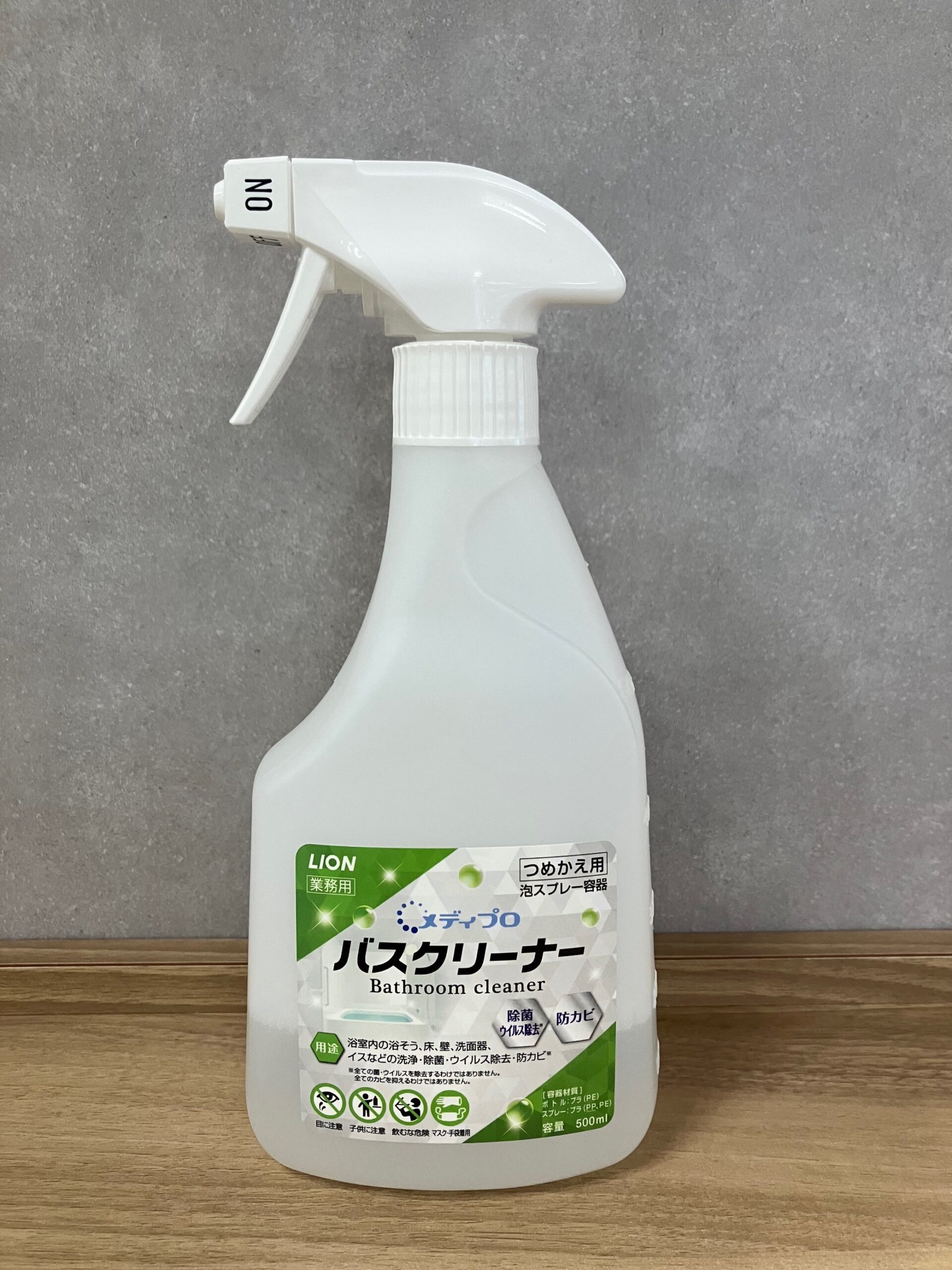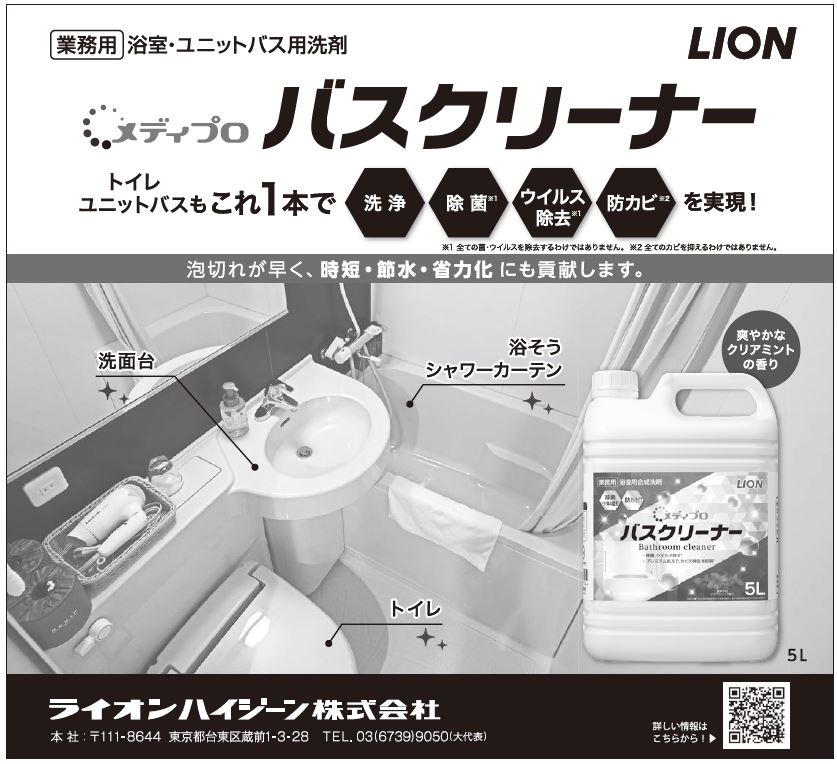 ライオンのグループ会社、ライオンハイジーンは、業務用の浴室・ユニットバス用洗剤「メディプロ バスクリーナー」を旅館・ホテルに提案している。この製品自体は2019年3月から発売されているが最近、浴槽だけでなく、トイレ、洗面台、シャワーカーテン、壁、鏡など、ユニットバス内まるごと、この1本ですべて掃除ができるようにバージョンアップ。使用範囲が拡大し、さらに使いやすくなった。