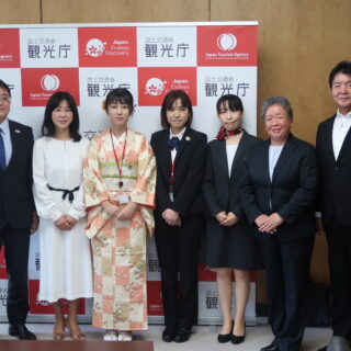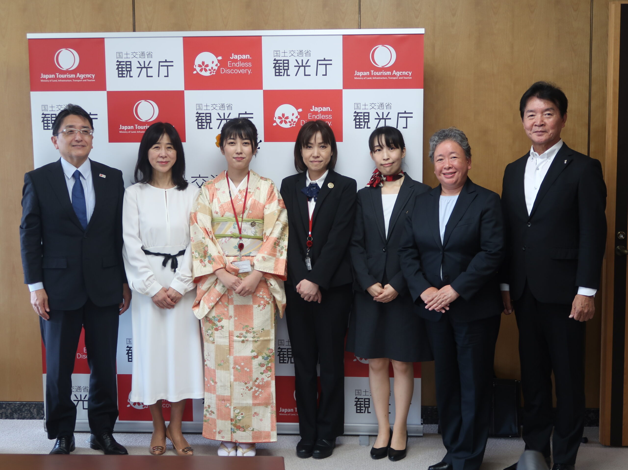 合格者は、ホテル一景閣の小野寺真知子さんと雉子亭豊栄荘の日野しずくさん、日本平ホテルの藤嶋朝子さん。長官への表敬訪問には日本の宿おもてなし検定委員会委員長の桑野和泉氏(由布院玉の湯代表取締役)、同委員でJTB協定旅館ホテル連盟会長の宮﨑光彦氏らも同行した。