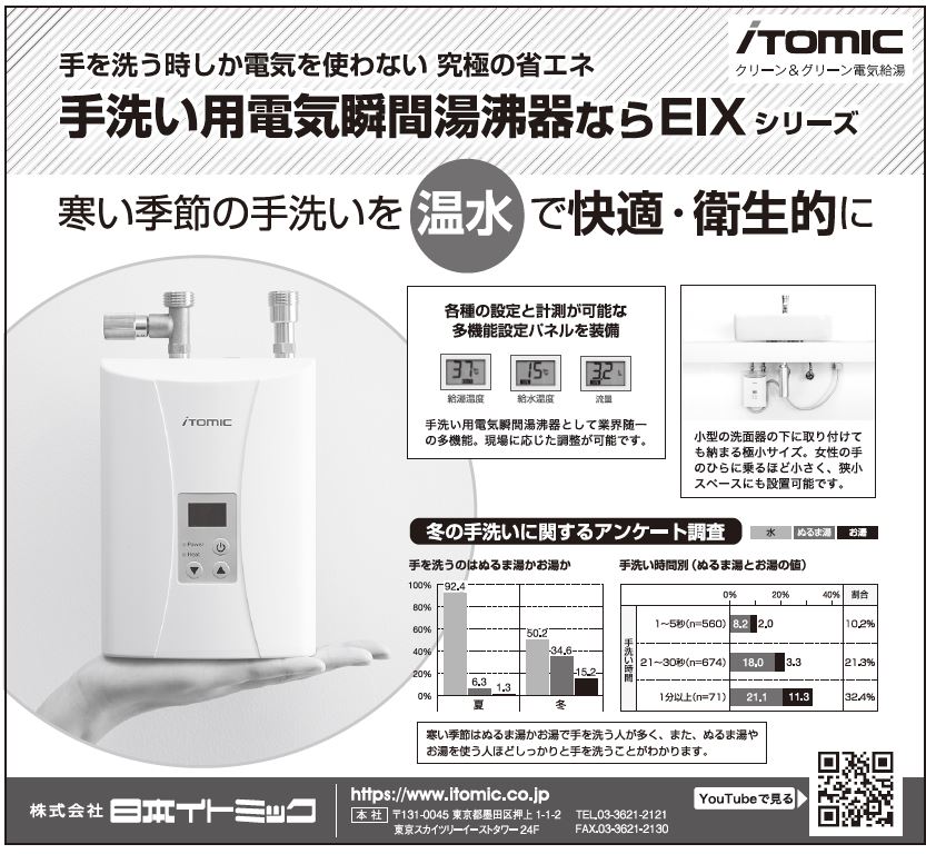 冬本番を前に同社では、温水でストレスなく快適な手洗いを実現する「手洗い用電気瞬間湯沸器EIXシリーズ」と自動水栓とのセット販売の強化に取り組んでいる。旅館・ホテルなどへの設置を提唱している。