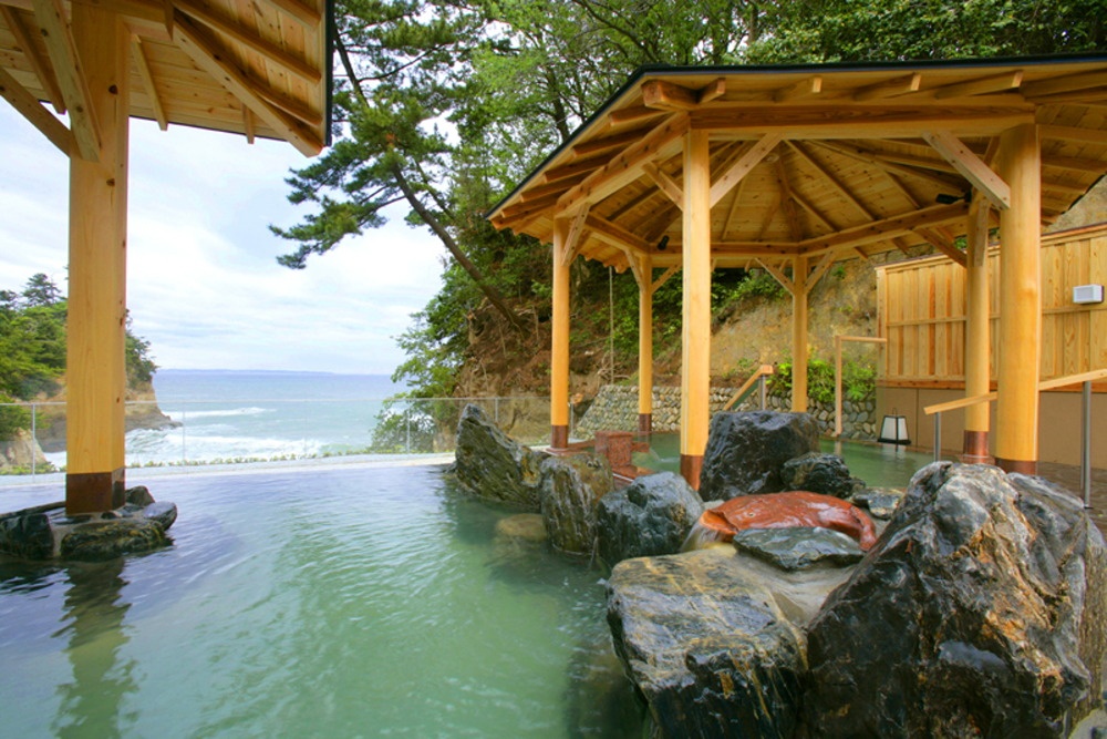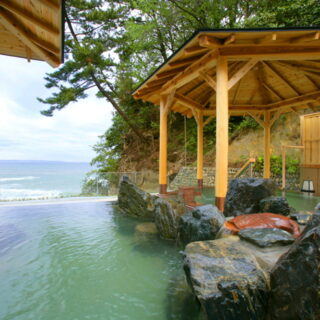 「湯」で体験したいのが、別館大観荘の大浴場「大観の湯」。2012年秋にリニューアルオープンした。露天風呂は雄大な太平洋を眺める景色の良さが自慢で、横山大観が描いた一幅の日本画のような海の景色に溶け込む一体感を満喫できる。内風呂も大きな窓越しに海を一望する。
