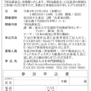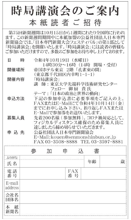 時局講演会「日本の政治と世界の動向」(御厨貴氏)に観光経済新聞の有料ご購読者を無料招待