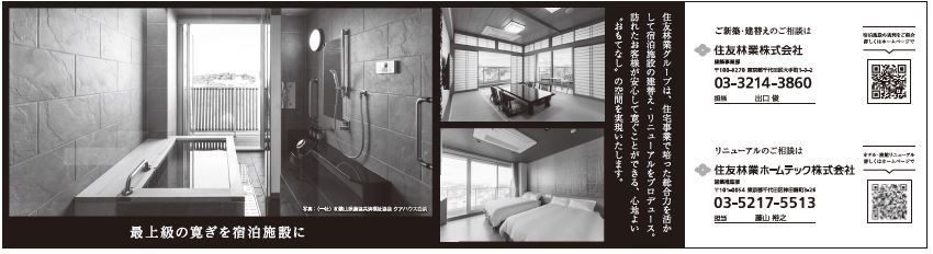 住友林業グループは、住宅事業で培った総合力を活かして宿泊施設の建て替え・リニューアルをプロデュース。訪れたお客様が安心して寛ぐことができる、心地よい”おもてなし”の空間を実現いたします。