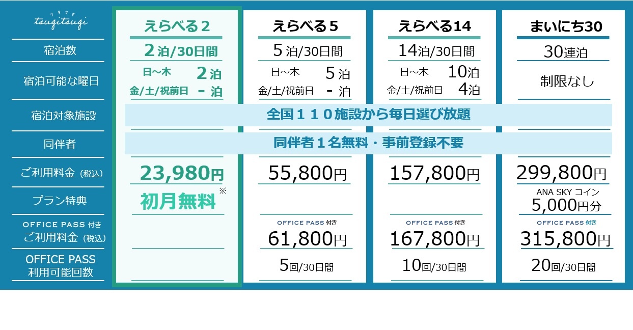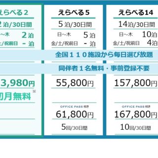 事業化に際し、個人向けとして「えらべる5」(30日間に5泊、5万5800円)、「えらべる14」(30日間に14泊、15万7800円)、「まいにち30」(30連泊、29万9800円)の3プランに加え、「えらべる2」(30日間に2泊、2万3980円)を導入。川本氏は「実証実験で『もっとライトに始められるプランが欲しい』との声を反映した」と導入の経緯を説明し、「えらべる5の利用を契機に、使いこなせそうだったらえらべる14にグレードアップするなど、入り口として良いプランができた」と述べた。