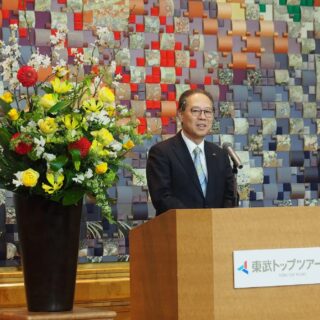 最後になりますが、今年の会社の経営方針(スローガン)は「誇れる仕事を」です。自分の仕事は大切なご家族など身の周りの人に対して誇れるものなのか、当社を支えてくれているビジネスパートナーに対して誇れる仕事なのか、地域社会に対して誇れる活動なのか。それらを考える1年にしていきたいと思っています。ひとりの人間として、ひとりの社会人として、自身のやっていることが誇れる仕事なのかをともに考え行動してください。そして、法令や社内ルールを守り、個人の倫理観を持つことが大切です。様々なことに関心を持ち、挑戦し、東武トップツアーズが社会にとって必要な会社となるよう、皆さん一緒に活動していきましょう。皆さんのご活躍を祈念しています。」