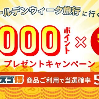 2024年4月27日(土)~2024年5月6日(月)出発の東武トップツアーズのWEB旅行商品を2024年3月22日(金)以降にご予約いただいた方の中から抽選で、2024年9月30日(月)までご利用いただけるトラベルポイント1,000ポイントを500名の方にプレゼントいたします。