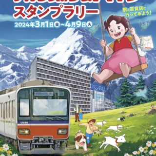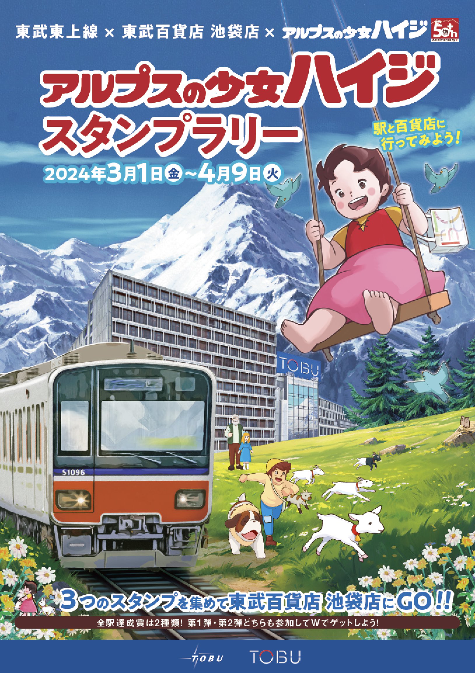 東武鉄道(東京都墨田区、根津嘉澄社長)は、「アルプスの少女ハイジスタンプラリー」を4月9日まで開催している。このスタンプラリーは、東武百貨店池袋店で開催されるアルプスの少女ハイジ展に合わせて、東武東上線の3駅(ふじみ野、坂戸、東松山)に設置されたスタンプを集めるもので、ハイジなどのキャラクターがデザインされたオリジナルスタンプが手に入る。