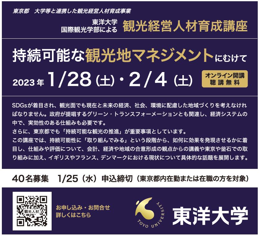 東洋大学国際観光学部 無料オンライン講座「持続可能な観光地マネジメントにむけて」1月28日(土)・2月4日(土)実施