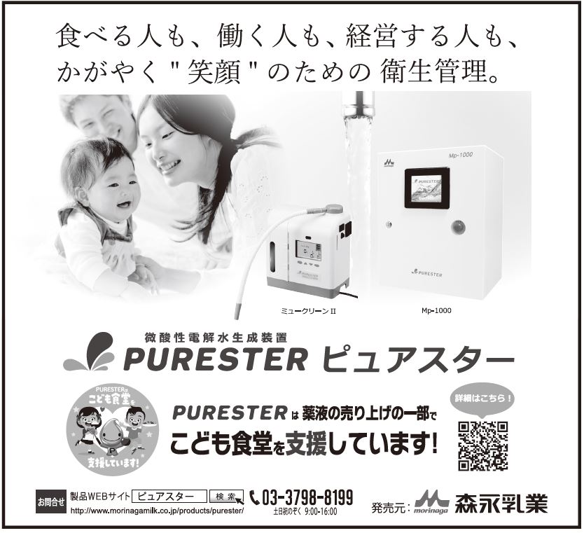 乳製品をはじめとした食品の老舗メーカー、森永乳業(東京都港区)は、微酸性電解水生成装置「ピュアスター」の導入を奨励している。ピュアスターは、同社が自社工場内の衛生レベル管理の維持向上を目的に開発。1996年から社外に販売を開始し、宿泊施設はもちろんのこと、飲食店、スーパー、介護施設、食品工場などに広く導入されている。