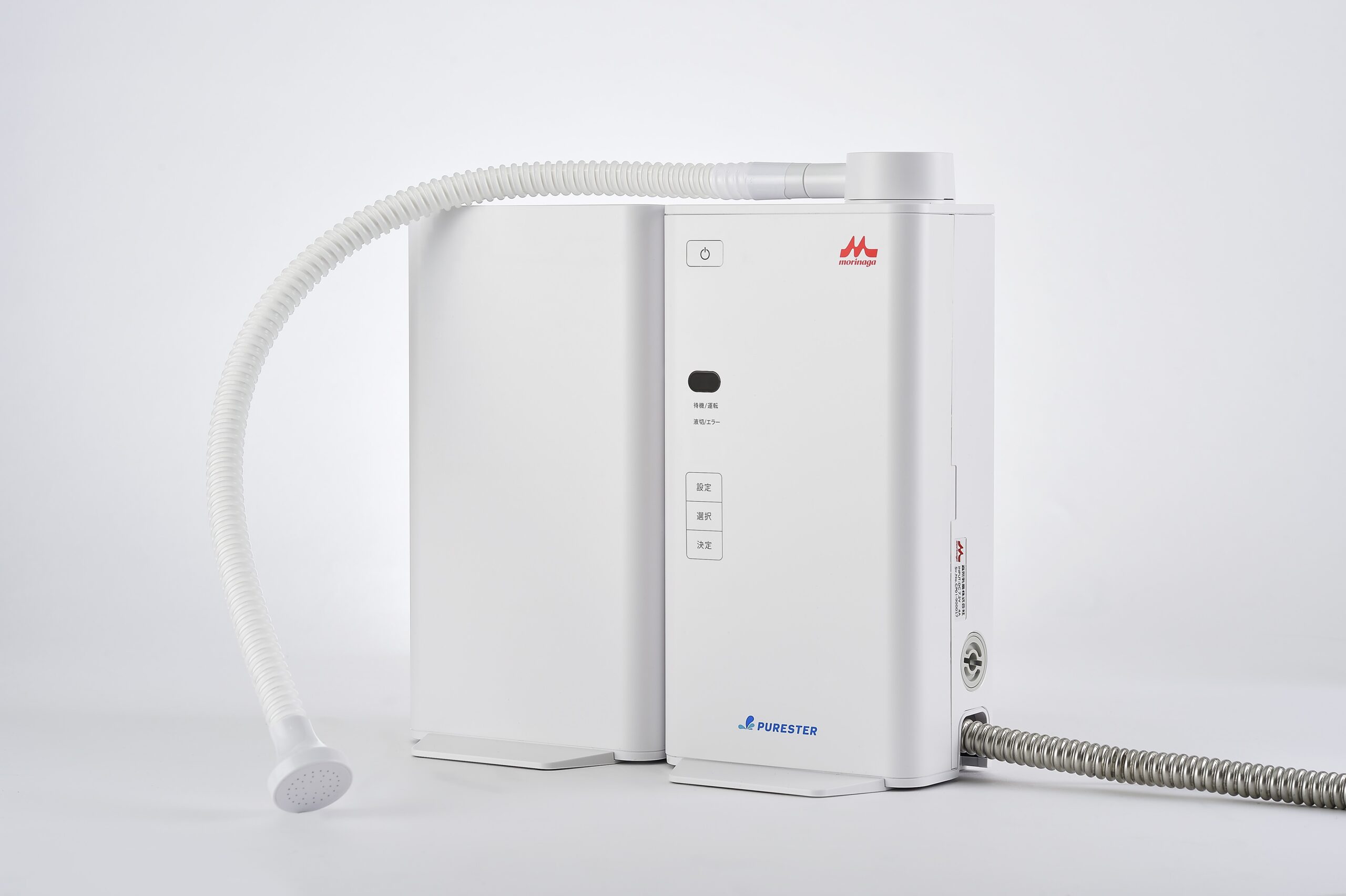 コンパクトピュアスター CP―180は、1時間当たり180リットルの塩素系殺菌料の微酸性次亜塩素酸水を自動で生成する。最大の特徴は、幅142×奥行き80×高さ288ミリとクラス最小サイズを実現した点。現行機種の小型機「ミュークリーンⅡ」と比べ本体の厚さを約半分にして、壁掛けでの設置を可能にしたほか、シャワーノズルを本体に施すなど、機能性に優れた設計を取り入れている。