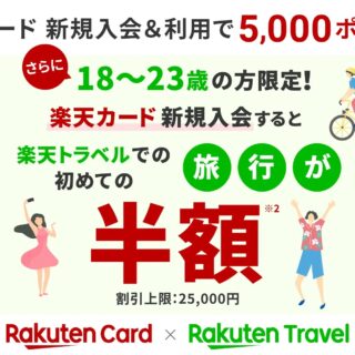 ※2 「楽天トラベル」半額クーポン進呈には、「楽天カード」お申し込み時点での年齢が18~23歳であることと、期間内に楽天カード新規入会が必要です。1回の予約で割引される金額の上限は25,000円となります。
