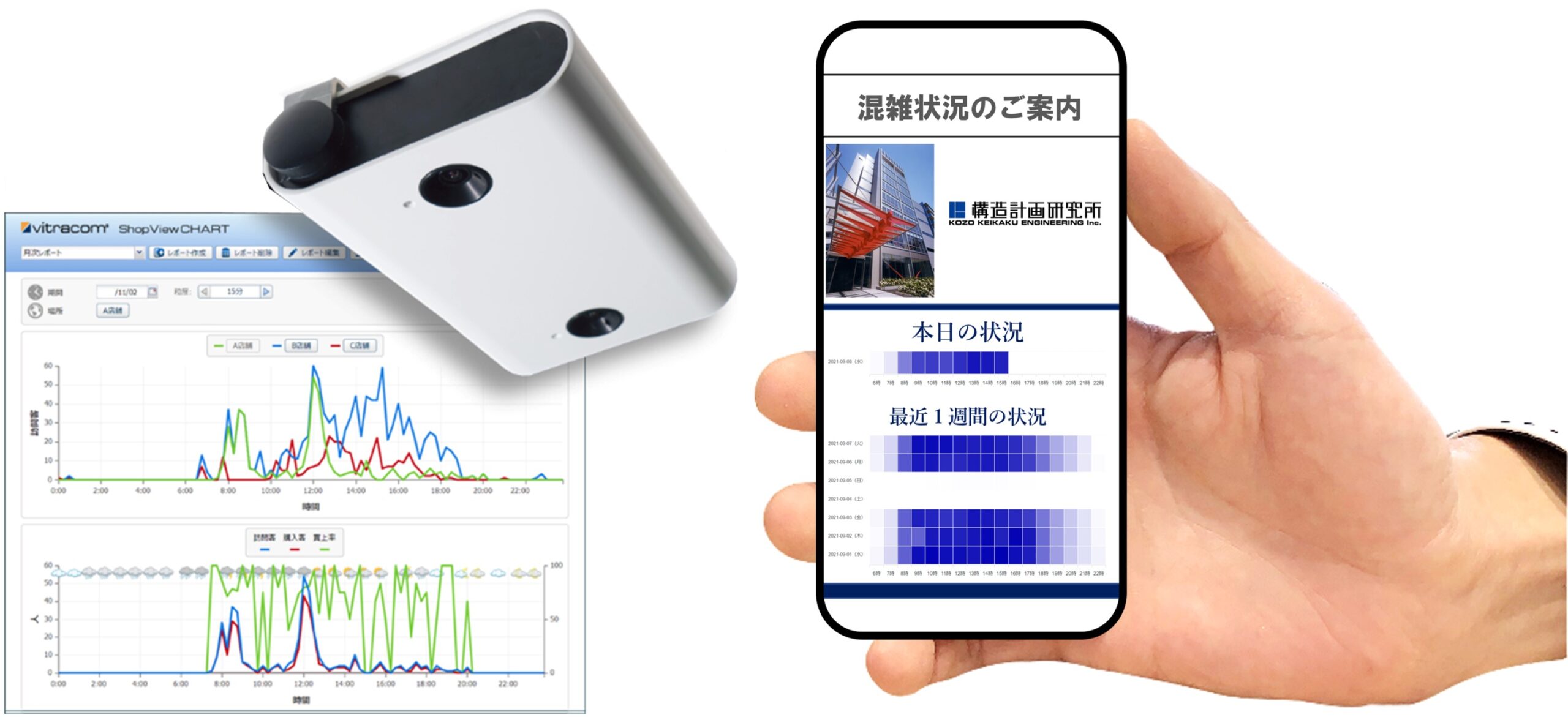 ピープルカウンターは、IoTとAIを活用。人数カウントセンサー「VC―3D」を施設の出入り口などの天井に設置し、インターネットと接続をするだけで、人の往来、滞留や、混雑状況を計測。