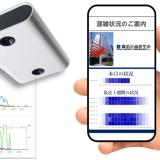 ピープルカウンターは、IoTとAIを活用。人数カウントセンサー「VC―3D」を施設の出入り口などの天井に設置し、インターネットと接続をするだけで、人の往来、滞留や、混雑状況を計測。