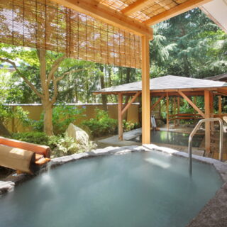 大浴場「俳句の湯」には、昭和の俳人、宇田零雨が詠んだ俳句の句碑やレリーフが。露天風呂には総ひのき造りと一枚岩をくり抜いた浴槽の「花見風呂」、「月見風呂」では総ひのき造りの壺風呂がある。空を眺めながら源泉掛け流しの湯に漬かり、至福のひと時を楽しみたい。館内では感染症対策を徹底。換気、消毒、抗菌、密回避など、万全の体制で取り組んでいる。