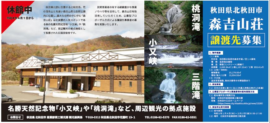 森吉山荘は、花の百名山と名高い森吉山県立自然公園内に位置し、北東麓の人気スポットである県の名勝天然記念物「小又峡」や「桃洞滝」など、周辺観光の拠点にもなっている温泉宿泊施設。 建物と付帯設備一式を無償で譲渡する。建物は鉄筋コンクリート2階建てで、延床面積約2千平方メートル。泉質はナトリウム・カルシウム-塩化物・硫酸塩温泉で、PH8.5のアルカリ性。源泉温度は53.6度。