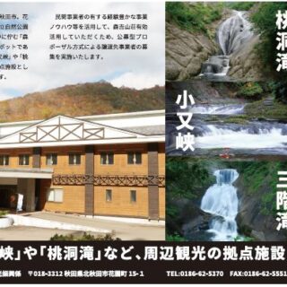 森吉山荘は、花の百名山と名高い森吉山県立自然公園内に位置し、北東麓の人気スポットである県の名勝天然記念物「小又峡」や「桃洞滝」など、周辺観光の拠点にもなっている温泉宿泊施設。 建物と付帯設備一式を無償で譲渡する。建物は鉄筋コンクリート2階建てで、延床面積約2千平方メートル。泉質はナトリウム・カルシウム-塩化物・硫酸塩温泉で、PH8.5のアルカリ性。源泉温度は53.6度。