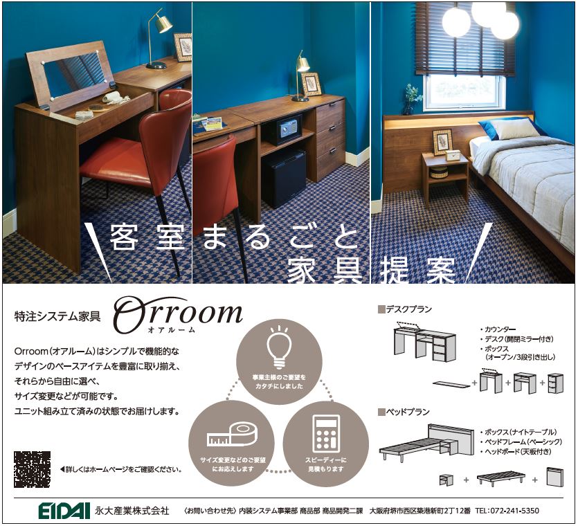 総合住宅資材メーカー大手の永大産業(大阪市住之江区)では現在、インバウンドの増加に伴い、宿泊施設向け特注システム家具「Orroom(オアルーム)」の活用を提唱している。
