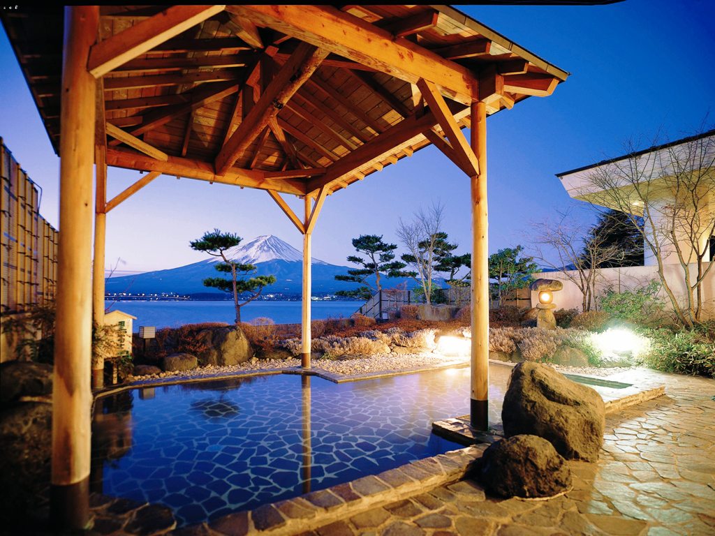 殿方露天風呂「黒富士」、ご婦人露天風呂「赤富士」は、いずれも正面に河口湖、その先に富士を望む絶景の浴場。