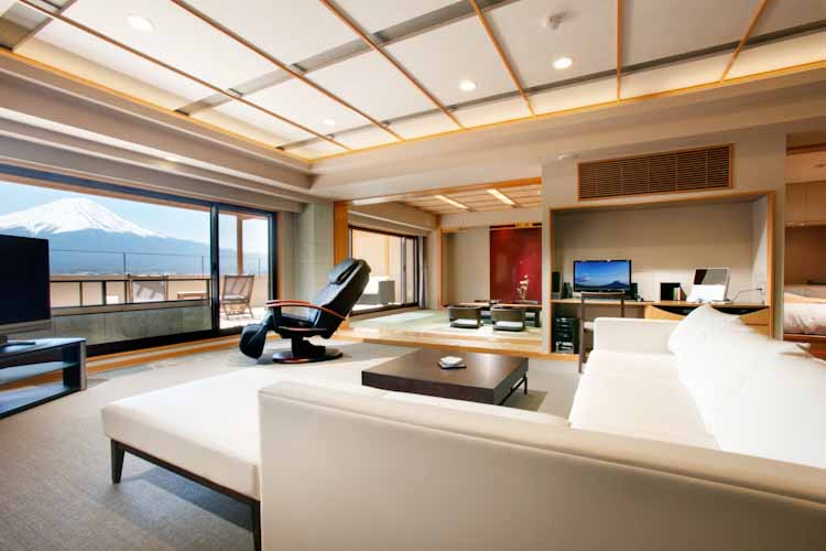 2階には、プライベート空間で富士を眺めながら温泉が堪能できる足湯付きの部屋と、足湯と露天風呂両方が付いた部屋を備えている。しゃれた土間のリビングとバルコニーを備えた和室や、22畳のリビングと10畳の和室、ダイニング、バルコニーの付いた特別室など、さまざまなタイプの部屋を用意している。