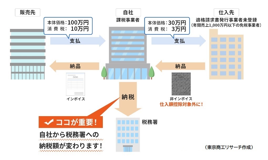 同制度開始に伴い、課税事業者は自社売り上げに課税される消費税を納税する際、仕入れ時に既に支払い済みの消費税分の控除を受けるためにインボイスが必要となる。そのため、仕入れ先がインボイスを発行できる事業者であるか否かを事前に把握しておくことが重要となる。仕入れ先がインボイス発行事業者未登録(非インボイス)の場合、仕入れ先へ支払った消費税が仕入れ額控除の適用外となり、消費税を多く納税しなければならなくなる可能性が生じるためだ=表。