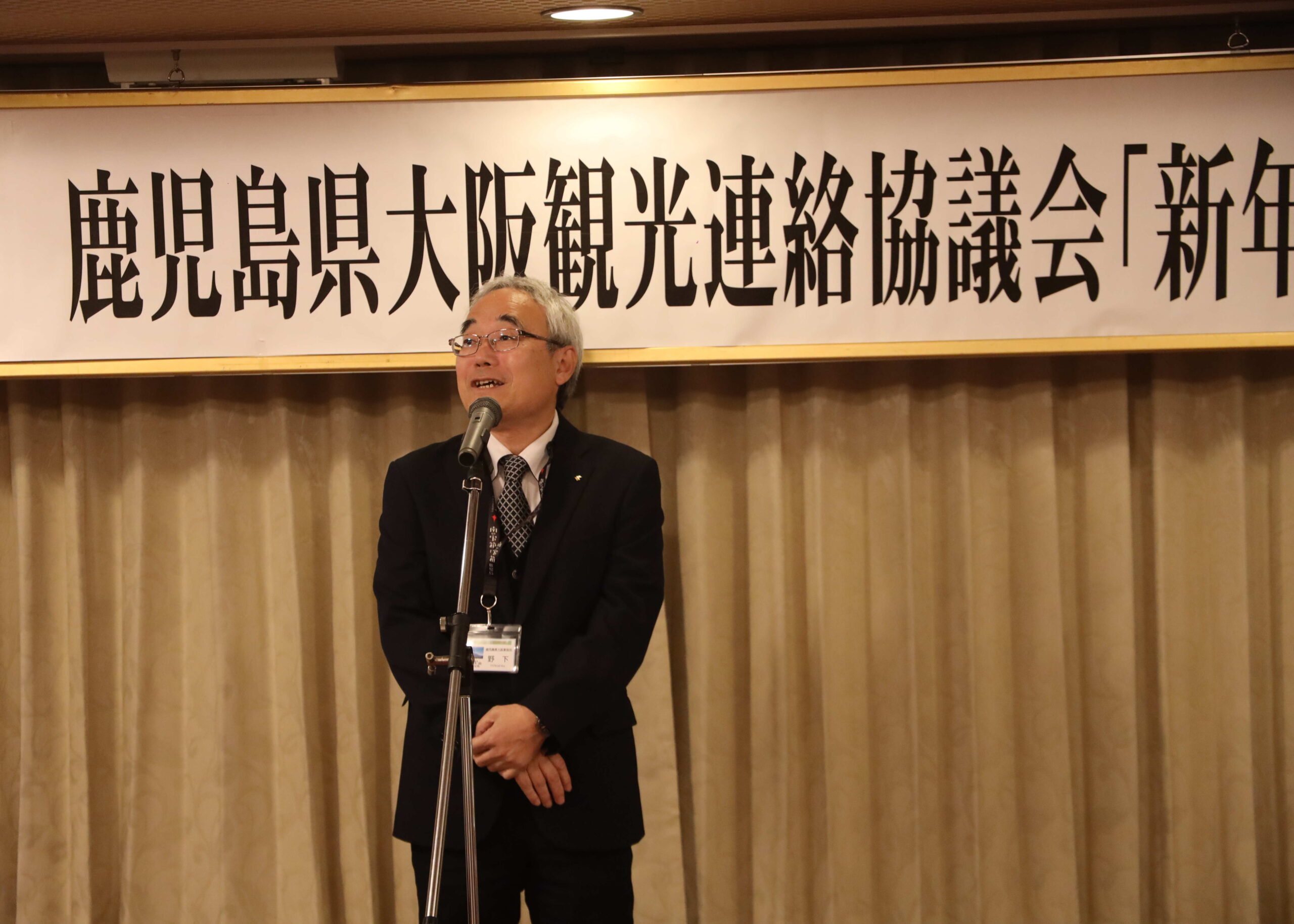 新年互礼会では、同協議会の会長を務める野下宏冶・鹿児島県大阪事務所長=写真=が「鹿児島県の宿泊者数がコロナ前の水準に戻りつつある。鹿児島観光の回復を確かなものにするため三つの世界遺産や日本一となった鹿児島黒牛など県の魅力を情報発信したい」とあいさつした。