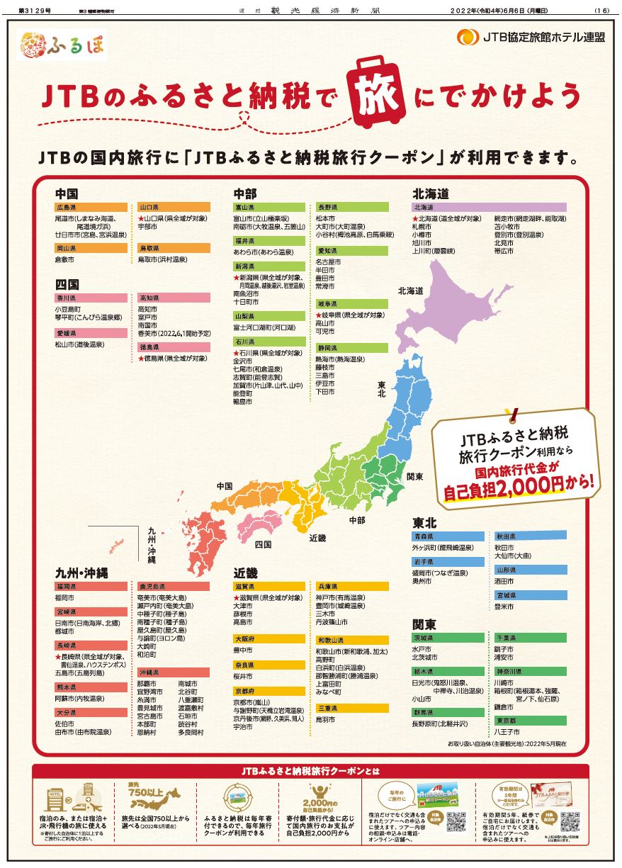 JTBの国内旅行に「JTBふるさと納税旅行クーポン」が利用できます。