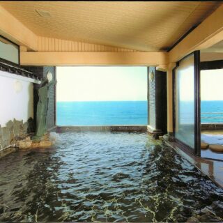 “東北の江ノ島”とも呼ばれる景勝地、由良海岸に佇む由良温泉八乙女(石川博一社長)。温泉は、昔からこの地に湧く「香頭源泉」と独自に掘削した「八乙女源泉」で、泉質の違う湯を浴場ごとに引き分けている。