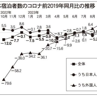 日本人延べ宿泊者数の19年同月比は、全国旅行支援の開始などで22年10~12月にプラスに転じ、23年2~3月もプラスだった。19年のゴールデンウイーク10連休の反動もあって4~6月はマイナス。7月には1.8%増となったが、8月は5.2%減だった。