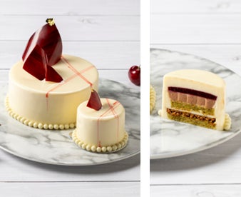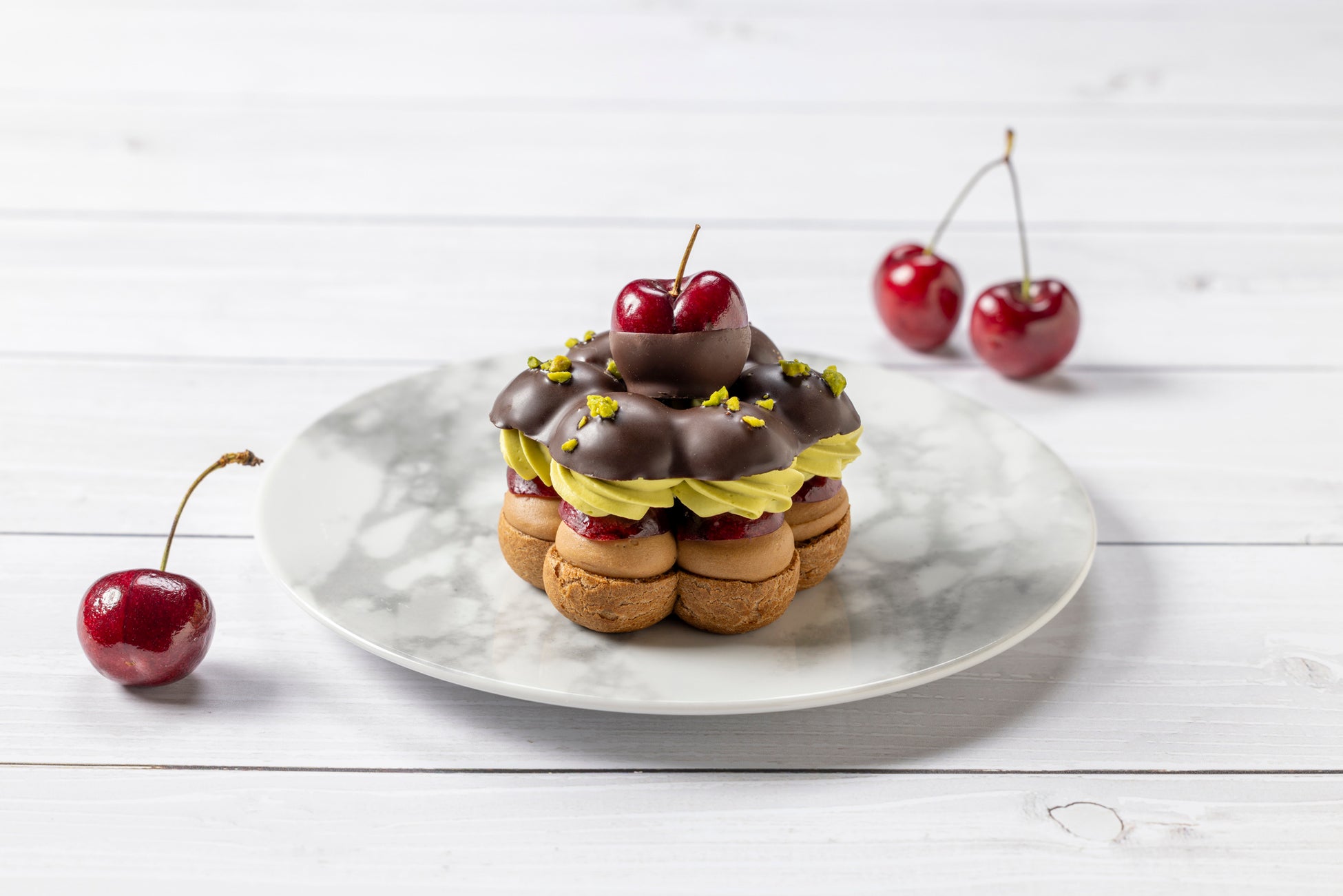 チョコレートのシュー生地の間に、絶妙な甘酸っぱさに仕上げた自家製のグリオットチェリージャム、チョコレートカスタードクリーム、フレッシュのアメリカンチェリー、ピスタチオクリームを重ねました。みずみずしく甘美なチェリーと風味豊かなピスタチオ、チョコレートのハーモニーと、シュー生地のサクっとした食感をお楽しみください。