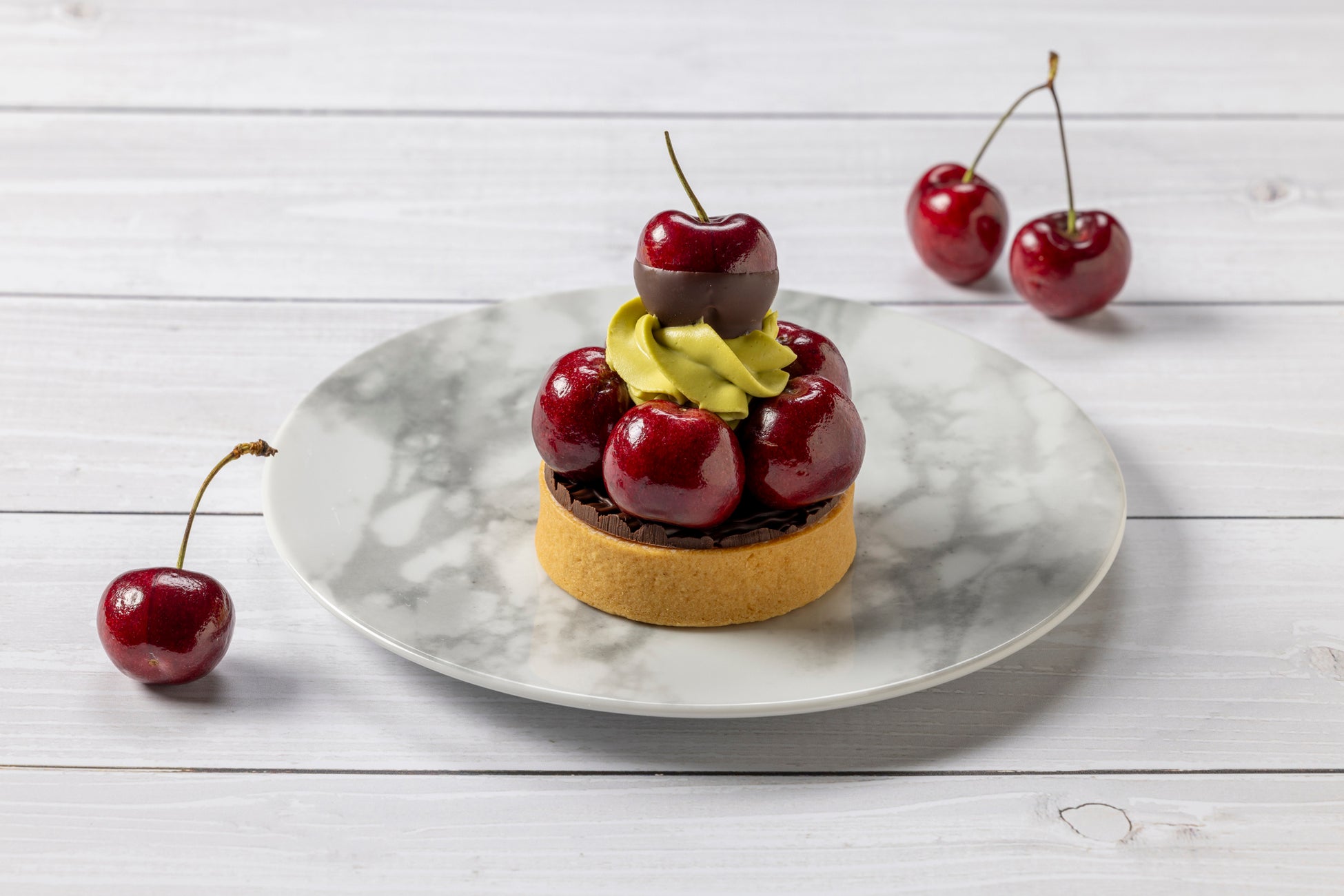 サクっと歯ざわりの良いタルト生地に、新緑を思わせる淡い緑色のピスタチオガナッシュと、ピスタチオクリーム、トップにはフレッシュのチェリーをあしらいました。大粒でみずみずしいチェリーがデコレーションされたチェリーがお好きな皆さまにもご満足いただける逸品です。