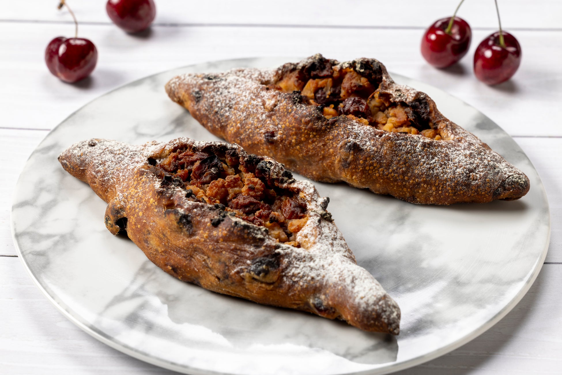 アマレーナチェリーとドライチェリー、くるみを合わせた風味豊かな全粒粉のパン生地で、蜂蜜とチェリーを練り込んだクリームチーズを包み、焼き上げます。アマレーナチェリーの独特の芳香と絶妙な酸味が味のアクセントとなったブレッドは、ワインとも合わせていただきたい大人の味わいです。