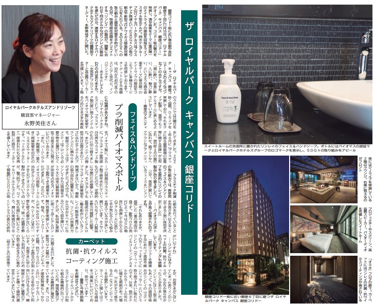 銀座コリドー街に近い東京都中央区銀座6丁目に11月16日、「ザ ロイヤルパーク キャンバス 銀座コリドー」がオープンした。コリドー街の魅力を発信し、酒や音楽をテーマに東京随一のナイトライフの提供を目指すライフスタイル型ホテルだ。同ホテルグループのロイヤルパークホテルズはプラスチック削減といったSDGsへの取り組みや新型コロナウイルス感染症対策に力を入れている。そのSDGsへの取り組みと感染症対策を手助けしているのが、快適な居住空間をクリエイトする「リンレイ」の製品だ。開業に合わせて同ホテルがなぜリンレイの製品を選んだのか。運営するロイヤルパークホテルズアンドリゾーツの購買部マネージャー、永野美佳さんに聞いた。