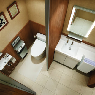 同社では併せて、パブリック洗面空間関連商品の「ハイバックカウンター」(奥行き400ミリ)をこの8月に発売しており、小規模施設などでも、快適な洗面空間を実現できる、と提案する。奥行き幅の狭い洗面空間も、洗面ボウル横にハンドドライヤーの設置が可能で、手洗いから乾燥までの動作がスムーズに行える。ほかにも、中規模、大規模施設に対応する「ツインデッキカウンター」も用意している。