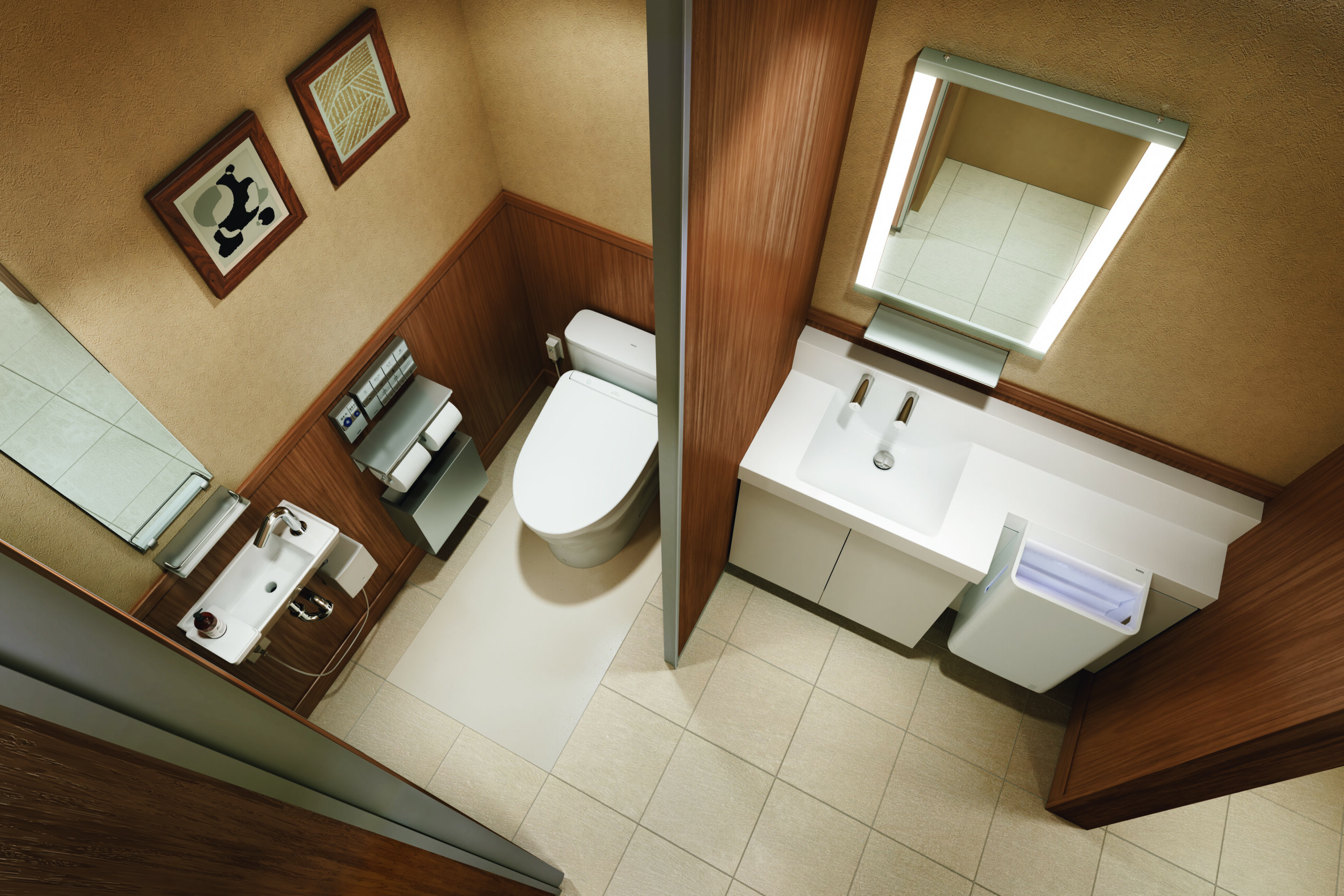 不特定多数の人が使用するパブリックトイレ空間用だからこそ、子どもから高齢者、体の不自由な人などすべての人々が使いやすいアプローチや、デザイン面にもこだわり設計。また、設備管理がしやすい清掃性など、機能も充実させた。「ペーパータオルと比較して経費の大幅な削減が可能で、環境貢献にもつながる」とアピールする。