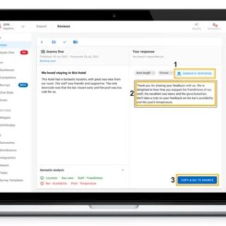 responseAIは、AI技術を活用し、ゲストから個別に届くクチコミの文脈に即した返信コメント(テキスト)を自動生成します。ホテルとクチコミ投稿者の名前を認識するテクノロジーにより、好みのトーンや文字量で返信コメントを作成することができ、クチコミの言語に基づいて自動翻訳(140言語以上)もします。また、施設特有のクレームやお褒めの言葉に対する返信方法をresponseAIに学習させることも可能です。それにより、宿泊施設のクチコミ管理担当者は、ゲストから届く様々なクチコミコメントに迅速に返信、回答することができ、施設からの返信コメントを待つゲスト(クチコミ投稿者)の待ち時間も短縮します。